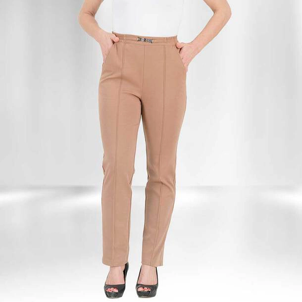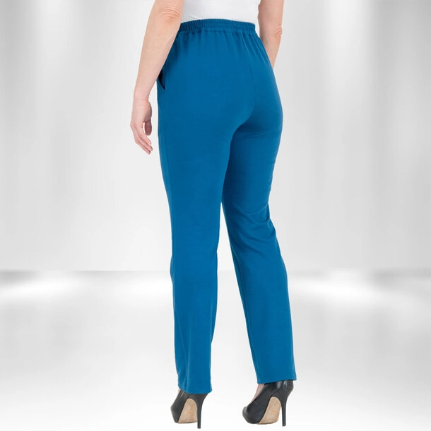 Crafted from breathable, easy-care fabric that retains its shape, the trousers feature a permanent front leg crease for a polished appearance. Practical details include two deep functional pockets, a pewter-coloured buckle, and an elasticated back waist that ensures a flexible, comfortable fit all day long. Available in taupe or cobalt, they pair effortlessly with both casual and smarter outfits.