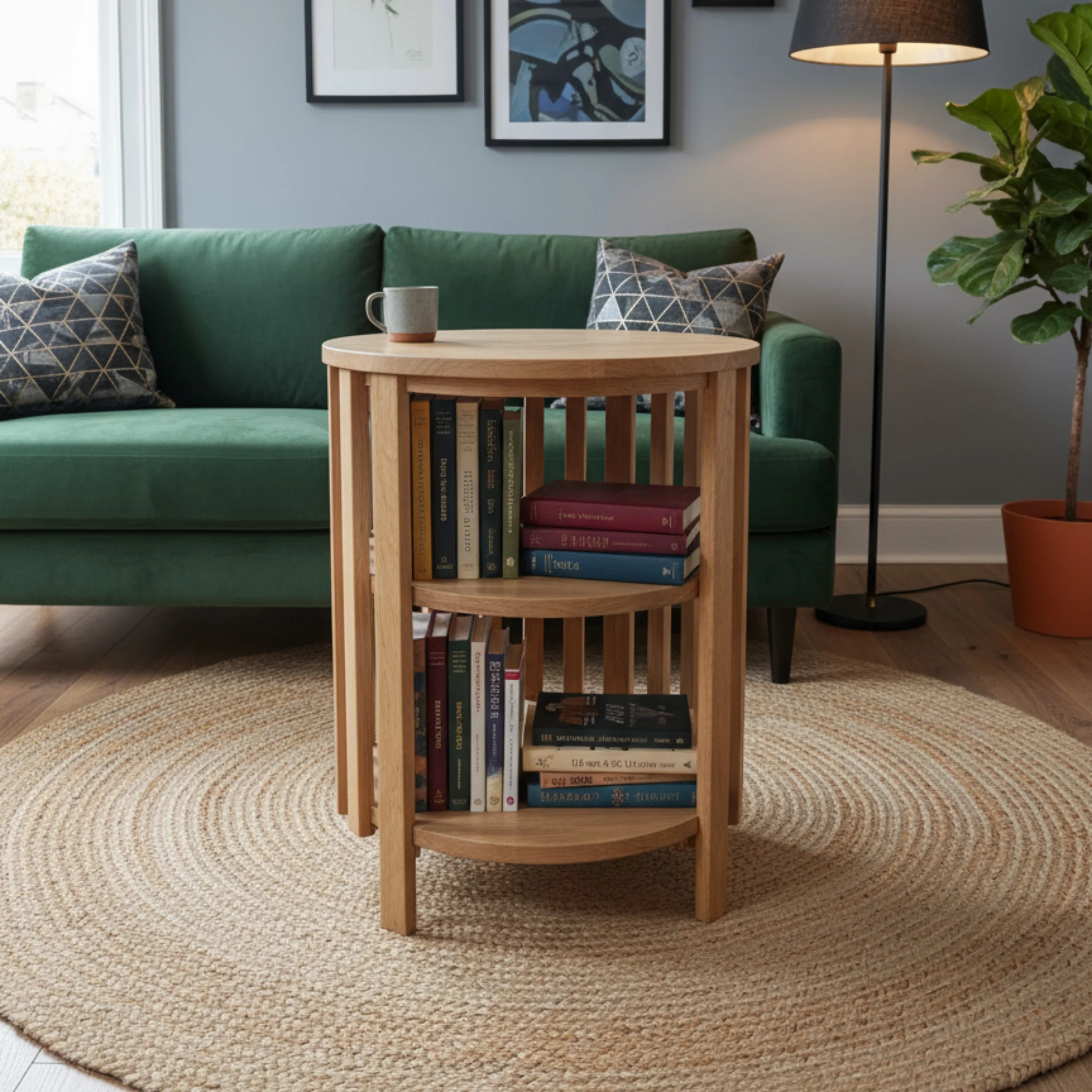 Practical as well as decorative, the table features two built-in shelves, perfect for storing books, magazines, or displaying decorative accessories. Compact and versatile, it works equally well beside a sofa, armchair, or in a cosy reading nook.
