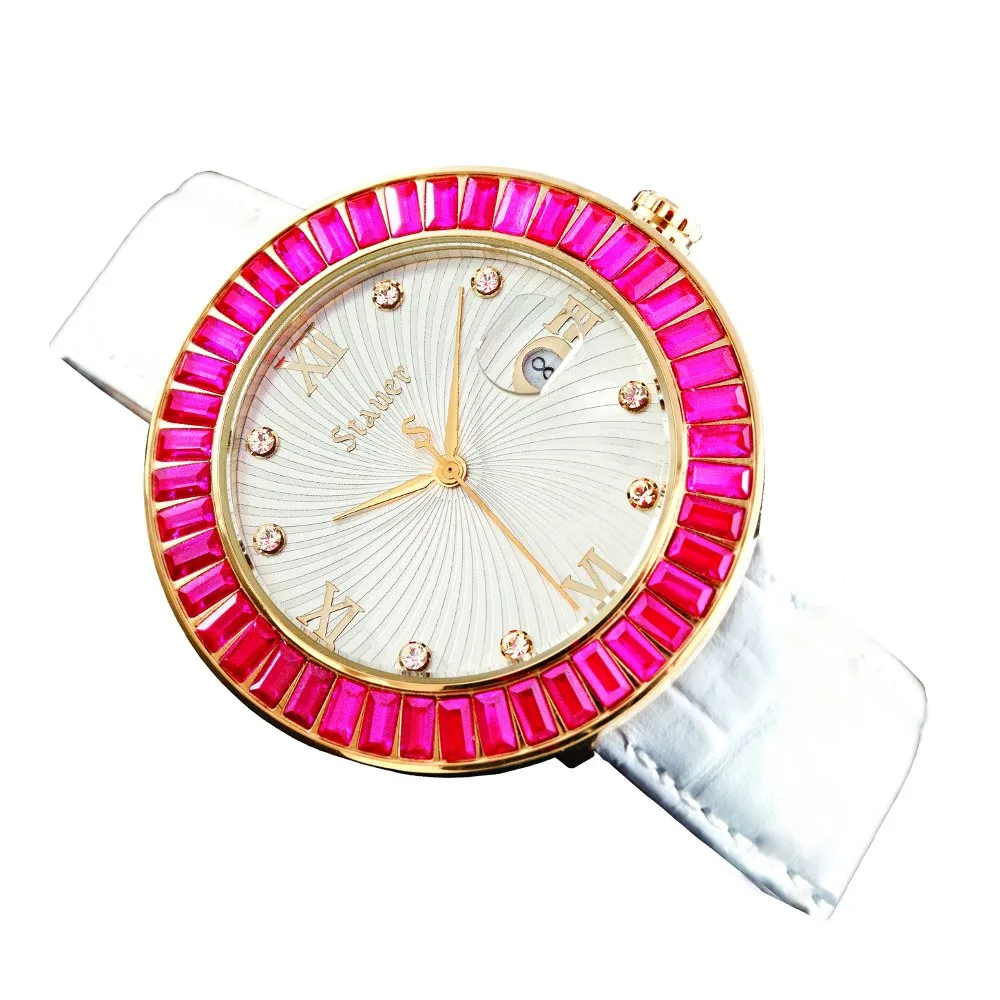 The Scienza rubies in this watch’s bezel are chemically identical to natural gemstones in every way. The chief differencebetween them is that the lab-created stunners have far fewer imperfections, and as a result display superiorcolour and beauty. And of course, they can be yours for a far less daunting price. In addition to the glittering stonebezel, weve set eight labcreated DiamondAura rounds into the swirling, decorative dial. Three golden hands andshimmering Roman numerals add extra dashes of opulence, and the white leather strap provides a sophisticated finaltouch. Youll also be happy to hear that we havent traded fashion for function. Thanks to a precise quartz movement,the Scarlett is a watch thats as accurate as it is beautiful.