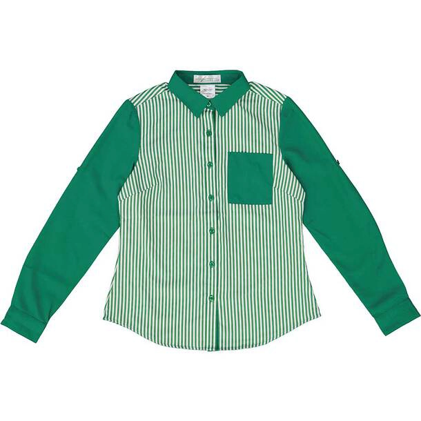 The shirt features a classic collar, button panel, and patch breast pocket for a polished look. Long sleeves can be worn down for a slightly more formal appearance, or rolled up and secured with handy tabs for a relaxed, casual style. Its flattering cut ensures comfort while maintaining a stylish silhouette.